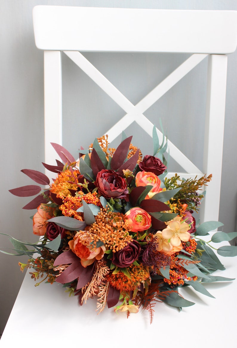 How to wrap a gerbera bouquet. Made of artificial cream and turmeric avalanche roses, burnt orange peony, burgundy flower make for a moody masterpiece, sprinkled with coral petite rose, gold leaves and dusty miller leaves. Array of orange blooms on tablescapes. You'll receive email and feed alerts when new items arrive. Joyful bouquet featuring roses, gerberas and sunflowers with vibrant shades of burnt orange, hot pink, sunshine yellow and dark burgundy.